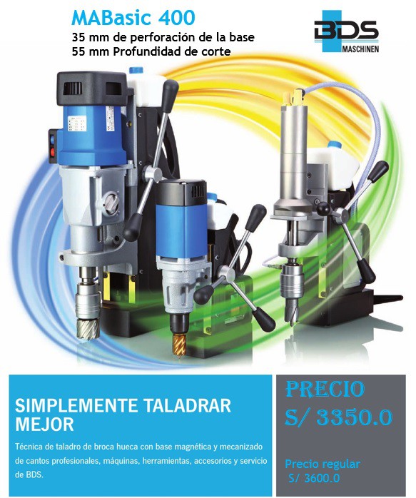 El taladro de 35 mm de diámetro de giro ideal para el rendimiento económico hecho en Alemania. Con altas magnéticas cortador de la brocha – bajo precio. BDS Maschinen está tratando de llenar un vacío con este nuevo broche magnéticas concepto de máquina cortadora para usuarios profesionales que no se puede comprometer la calidad o el rendimiento, pero que son capaces de renunciar a la comodidad y accesorios para el beneficio de los buenos precios. Potente y fiable, sistema de lubricación interna, compacto y ligero, MABasic 400 máquina de corte broche magnético puede perforar hasta 1-1 / 2 «de diámetro., 9.5 Amp motor de doble aislamiento, 3/4» Arbor directa Usos cortadores anulares, la perforación de la torcedura hasta 3/4 «de diámetro .; 6-1 / 3» golpe con la tirada, con un 1/2 «mandril, los base 400 se convierte fácilmente en la prensa de taladro de serie con un 6-1 / 3» golpe de brocas helicoidales convencionales.